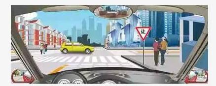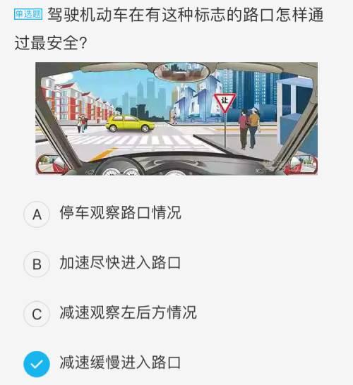 图中右侧有倒三角样式的减速让行标志,因此排除A、B。而路口前方有车辆通过,右侧有行人,应该紧密观察前方和右侧,而不是左后方,因此排除C。最正确的应该是减速缓慢进入路口。